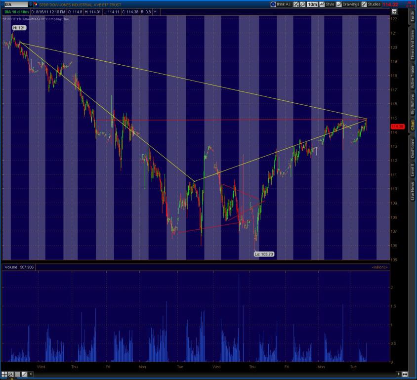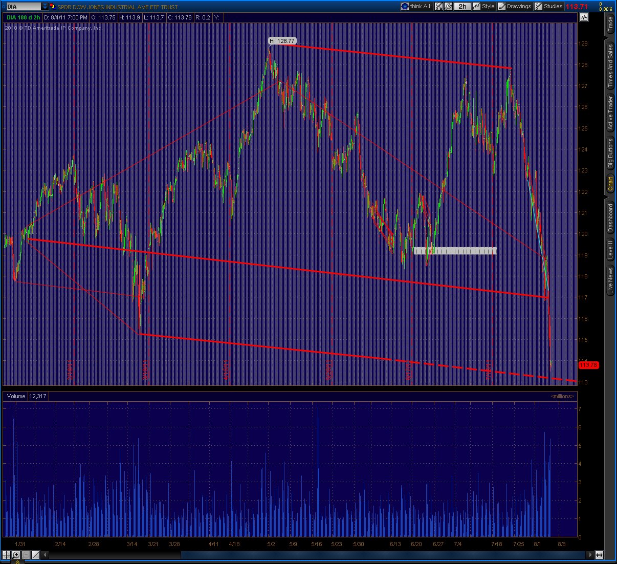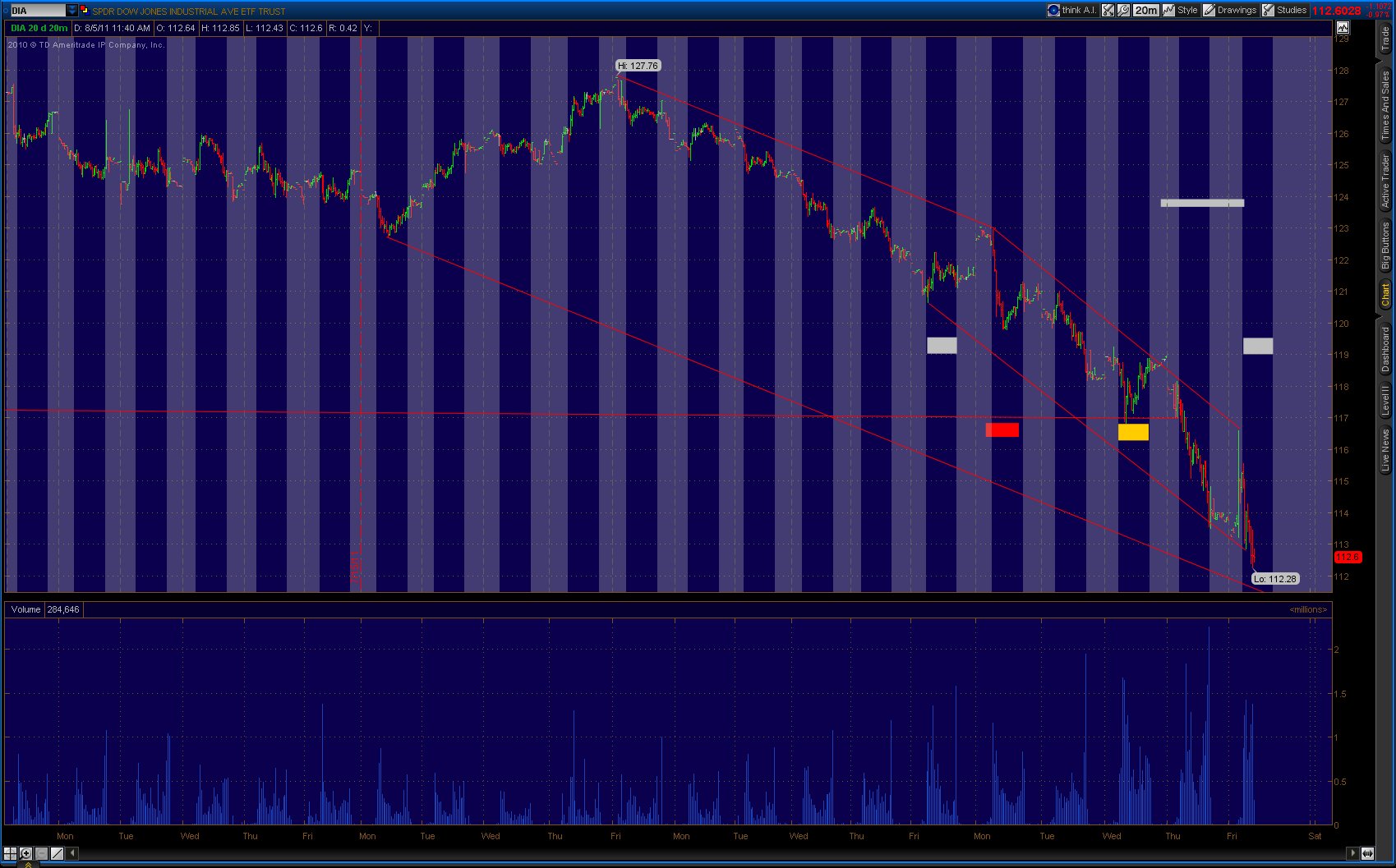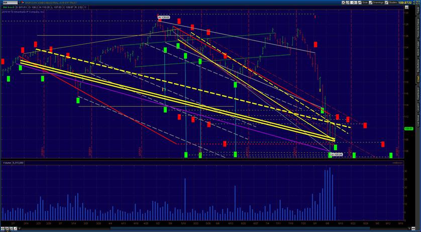 Extending the channel bottom vector from this coming Monday's '3 weeks ago' backdate (when the last sustained short-term three day rally started) through today's timeframe will yield an 'end day price equivalency low' (EDPEL) on the DIA for today at about $111.30.